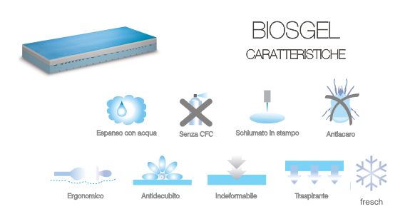 Materasso a base di gel con memoria di forma, le pressioni vengono azzerate dove il peso è maggiore e nel contempo la superficie a contatto con il corpo si espande aumentando il comfort. Disegno anatomico per garantire l’ergonomia, traspirante, fresco e termoregolatore, ideale per chi è costretto a letto anche per lunghi periodi.
